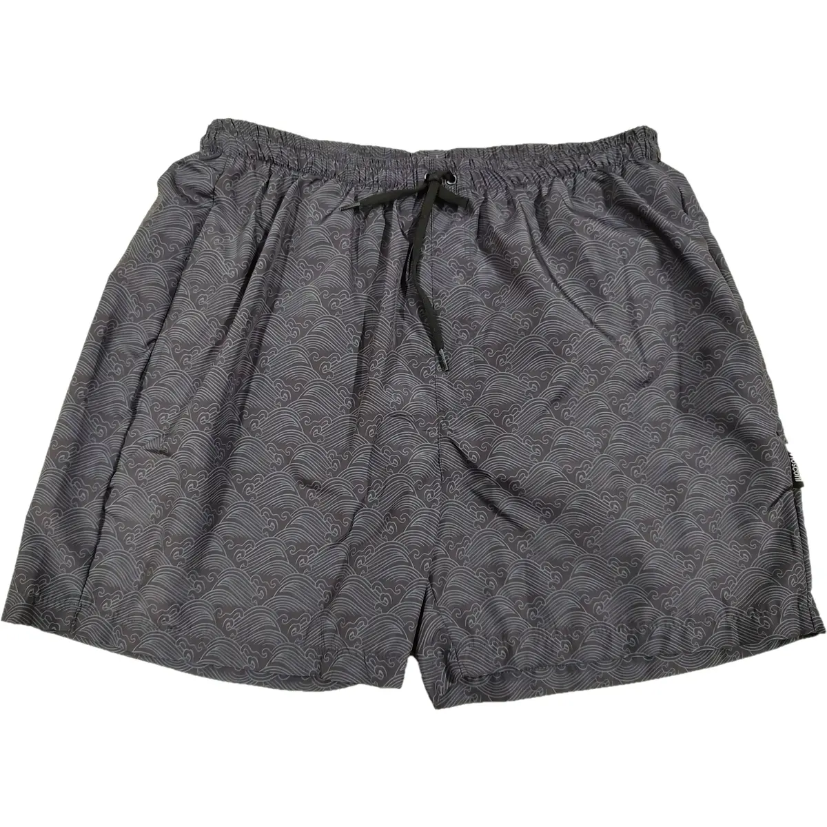 Къси панталонки, направени от бързосъхнеща материя, с връзки за пристягане, удобна кройка, черен цвят с принт на вълни. Колан с връзка за регулиране на ширината.