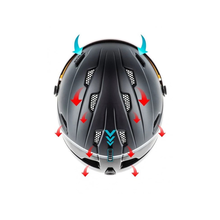 Проектирана така, че да осигури защита и да предпази главата от сътресения и наранявания при сблъсък, като намалява силата на удара и поема вибрациите. Наушниците и цялата вътрешна част на каската могат да се махнат. Изключително лека, компактна и удобна. Система за регулиране на вътрешния обем.
